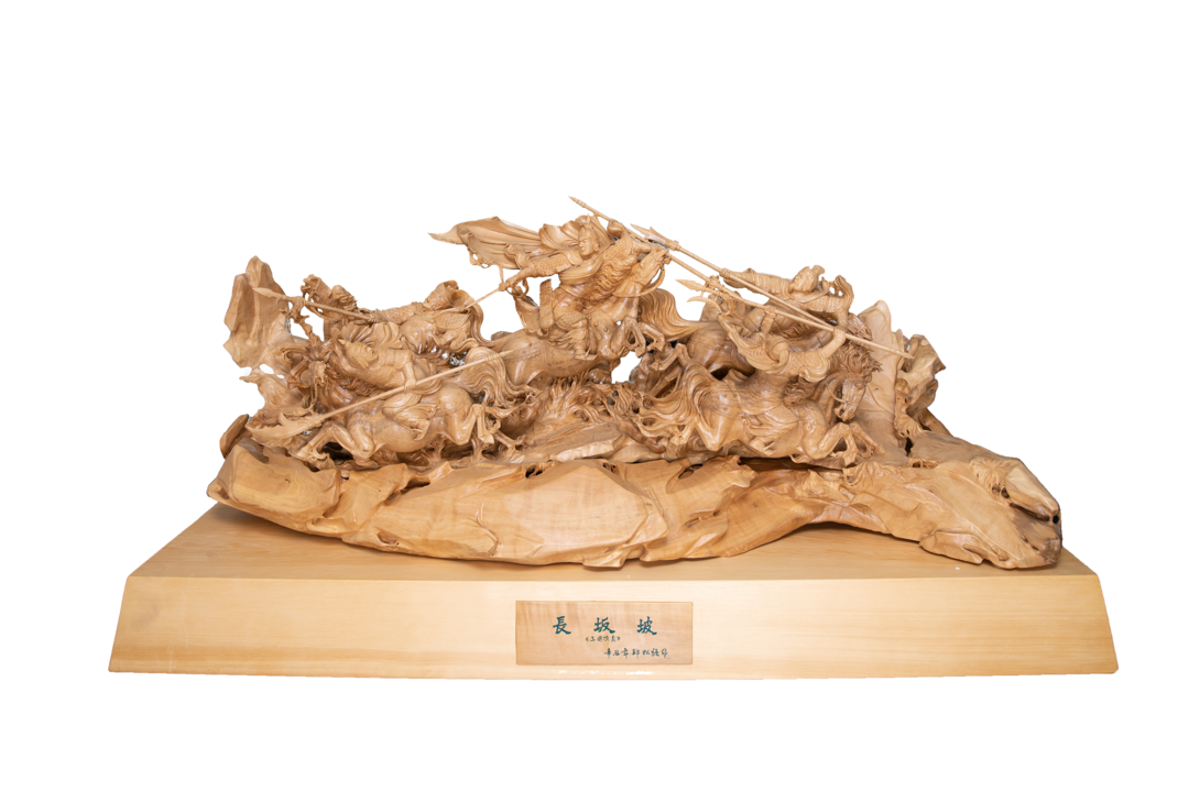 作品《长坂坡》选用了较大的整段黄杨木为材雕刻而成,继承和发扬了乐清黄杨木雕的优秀传统,沿用了乐清黄杨木雕的传统技法,刀法熟练多变,刻划细腻生动,充分应用了浮雕、镂雕、透雕等多种手法,以民间喜闻乐见的历史故事、英雄人物为题材。同时,作品又突破了传统黄杨木雕以单人圆雕为主、尺寸较小的局限,制造了一个“赵子龙百万军中救阿斗”的宏大战斗场景,进一步烘托出仁义、忠勇的三国名将赵云的光辉形象。