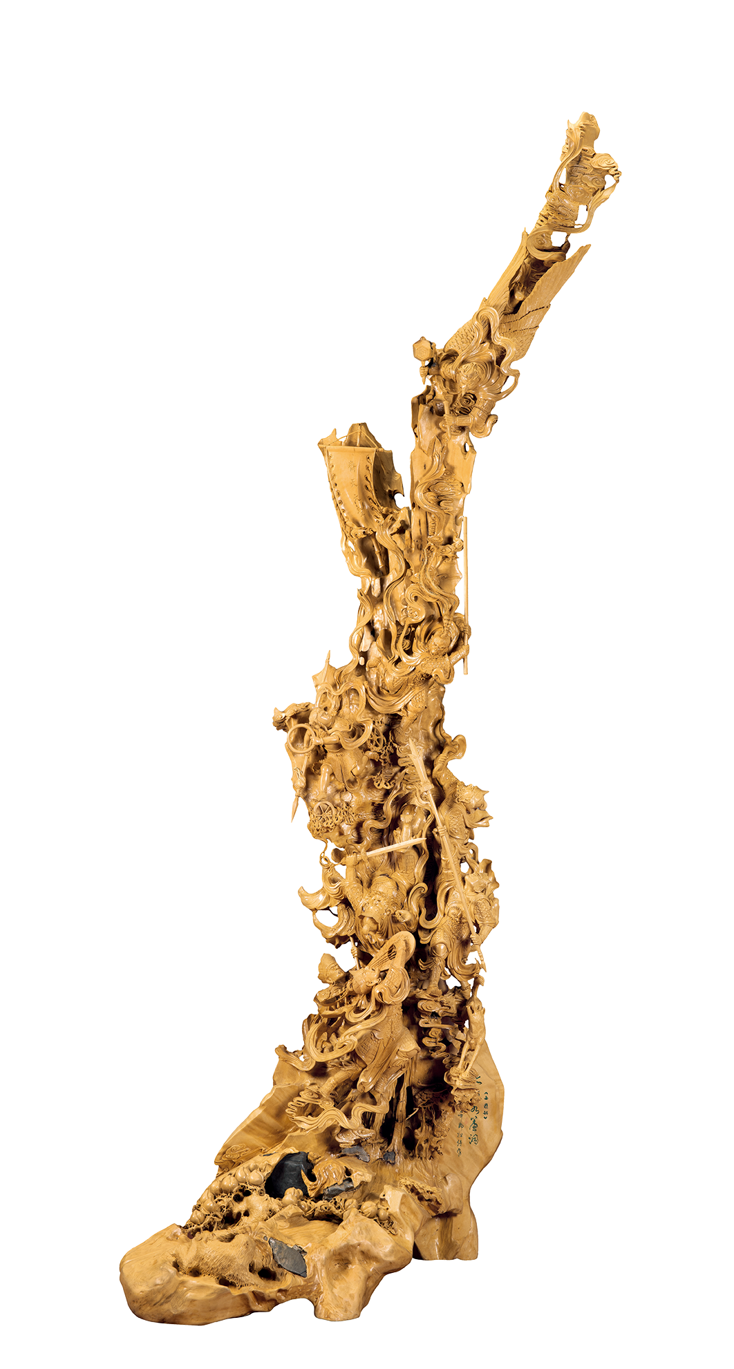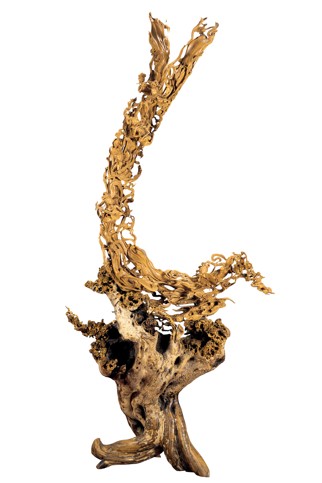 作品创作于2011年,是郑松强大师向中国共产党建党90周年献礼的精美之作。这样高2米多的大型黄杨木雕可谓凤毛麟角,难得的是作品的艺术表现力和感染力也可圈可点。作品中8个飞天仕女,形象娟秀,在她们之间以云彩相缀,云衣飞扬,满壁风动。同时,作品同时运用浮雕丶镂雕、透雕等多种技艺,别具新意,完美表现出飞天仕女粉颈玉臂,质感晶莹剔透。也因此该作品在2012年中国工艺美术“百花奖”展赛中,得到一致好评,名列前茅,荣获金奖。