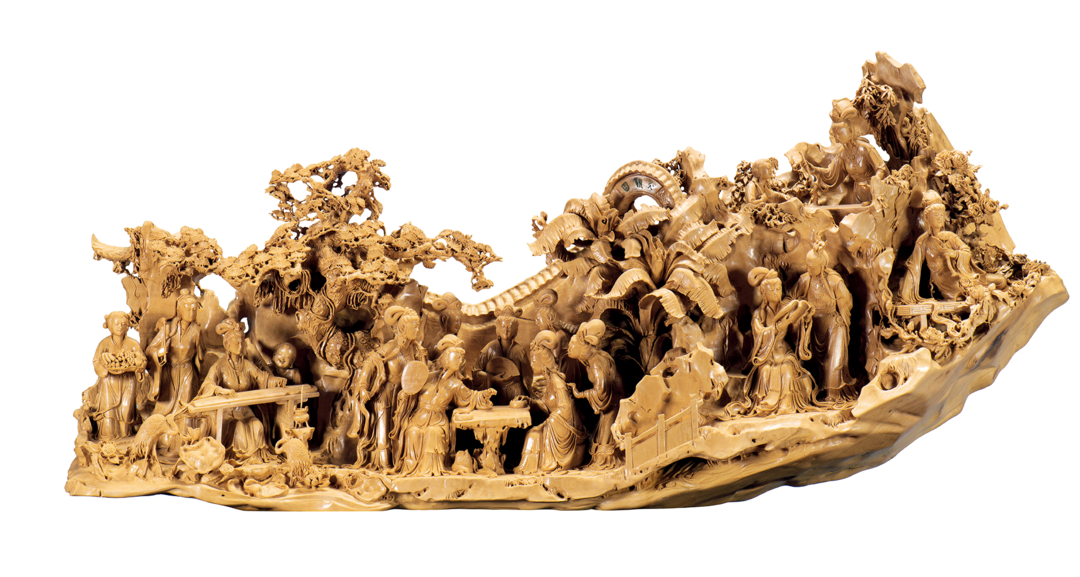 作品取材于中国四大名著《红楼梦》。而且构思巧妙,场景宏伟,人物众多,有的下棋,有的作画,有的读书,有的吟诗,有的赏花......20多个人物几乎都雕得精细入微,组合有序,互相呼应,情景交融,浑然天成,美不胜收,生动地再现了当时大观园里的那种曾经的辉煌和欢乐。