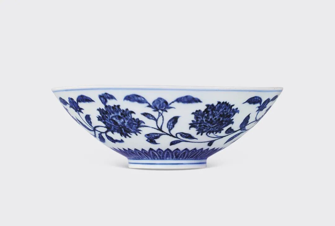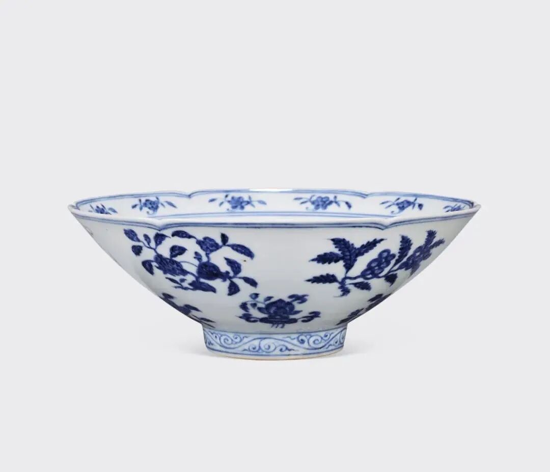 本品为宣德窑业兴盛之佳例,为六瓣葵口式,斗笠形,沿袭宋瓷定窑、官窑之式;造型别致,自见赵宋洗练简约之美,尽显曲线变化之佳妙,造型似仿自汝官宋器。胎质细腻坚致,釉汁莹润亮青,全器内外纹饰疏朗而饱满,外壁装饰两重纹样,上为六组折枝瑞果纹,下为六组折枝花卉纹,交错布置,内壁口沿缀饰十二式花果纹,下承六组折枝花卉纹与外壁纹饰相对应,碗心则是绘以折枝寿桃纹。祥花瑞果是永宣青花最为经典的纹饰,本品涵括了所见的主要品类,祥花如菊花、牡丹、莲花、茶花,瑞果如蟠桃、枇杷、荔枝、石榴、葡萄、樱桃。其绘画写实逼真,诸花妍放生姿,众果饱满诱人,充分借鉴国画的笔墨意韵,得其法度,勾、勒、点、染诸法,运用皆宜。线条粗细并用,青料浓淡兼施,从而令画面富具苍翠欲滴的意趣,透出凝重雄浑之美。底部浅圈足,胎骨细腻,露胎处微微泛黄,抚之光润如玉。底落青花“大明宣德年制”楷书款,朴拙苍健,古意盎然。