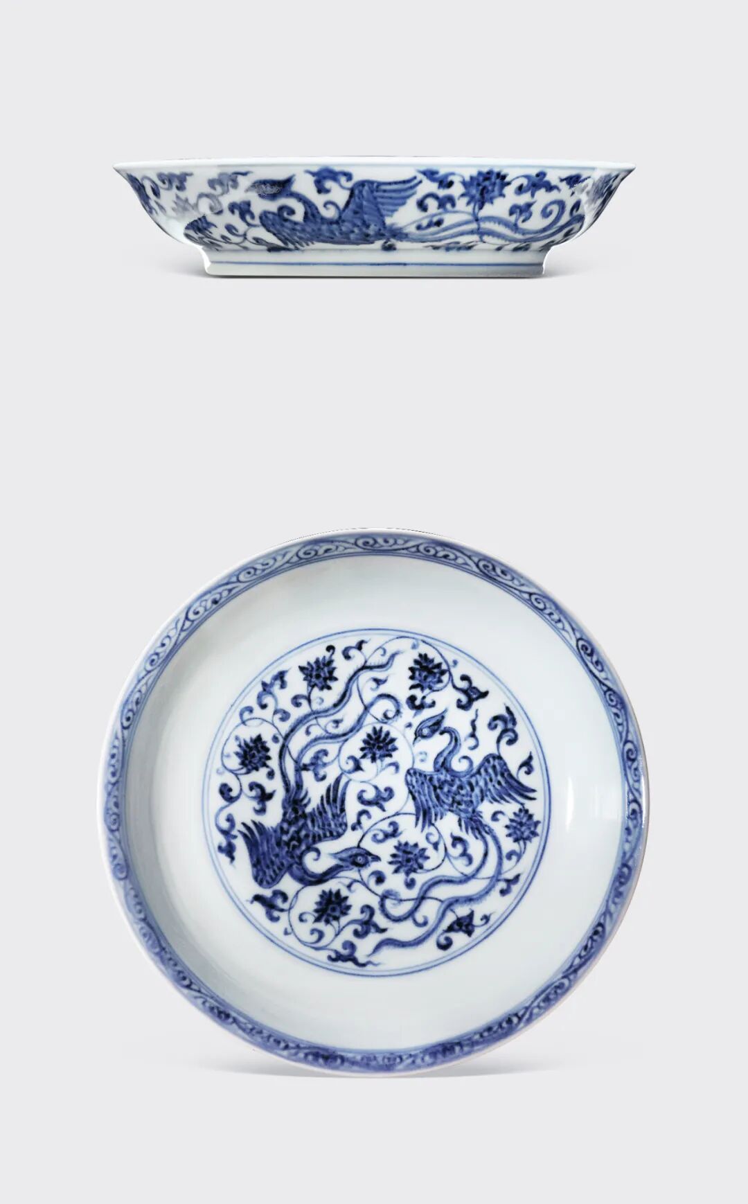 此碗为明代青花名品,传世甚少,至为名贵,传世作品多见博物馆藏,市场流通极少;其造型、尺寸及纹样皆与两岸故宫及上海博物馆藏品相近,台湾馆藏一例可见(台北故宫博物院,《明代宣德官窑菁华特展图录》,图版61号);上海博物馆馆藏一例,著录于《青花釉里红》,图版55号;北京故宫博物馆馆藏一例,为清宫旧藏(著录于北京故宫博物院,《故宫博物院藏明初青花瓷,下册》,图版142号)。上海博物馆同时藏有此式碗的雍正朝仿品,以极力模仿之姿彰显出原作无可比拟的隽永精致。与本品相类作品还见于法国巴黎吉美国立亚洲艺术博物馆(MusEee Guimet)。