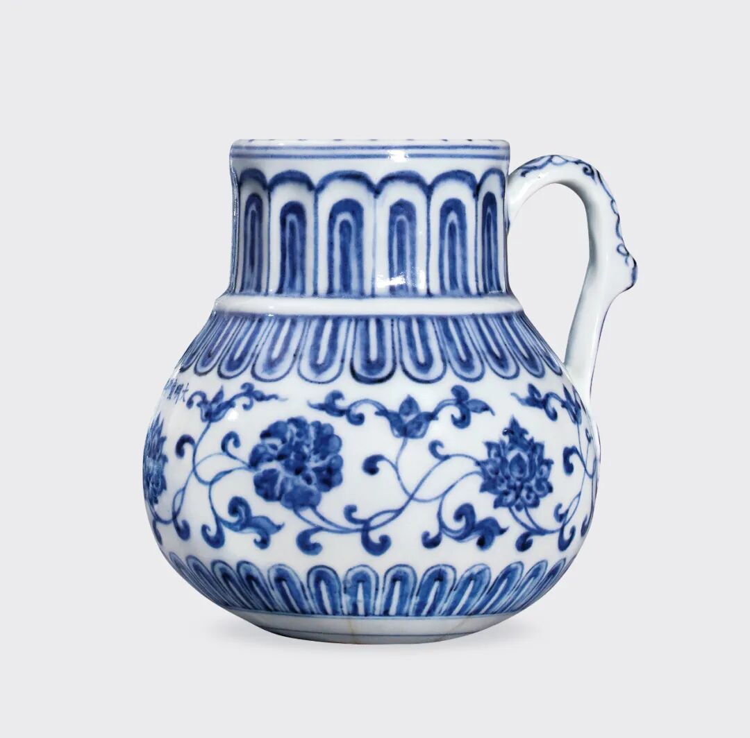 宣德青花以进口的苏麻离青料绘制,青花发色青翠沉稳,深浓处多黑褐色结晶斑。结晶斑系钴料中窜出,或浮于器表,或下陷于胎骨,使宣德青花更加妙不可言。腹上留白处书青花六字单行款“大明宣德年制”。此类花浇似乎深得雍正帝(1723-35在位)青睐,两幅雍正《古玩图》,记录清世宗御藏珍器,分别断代1728及1729年,画中可见三件早明花浇,形饰相近,下承木座,其一出自大维德爵士旧藏,现存大英博物馆,其二现存伦敦维多利亚与亚伯特博物馆,见《盛世华章》,英国皇家艺术学院,伦敦,2005-6年,编号168 and 169。
