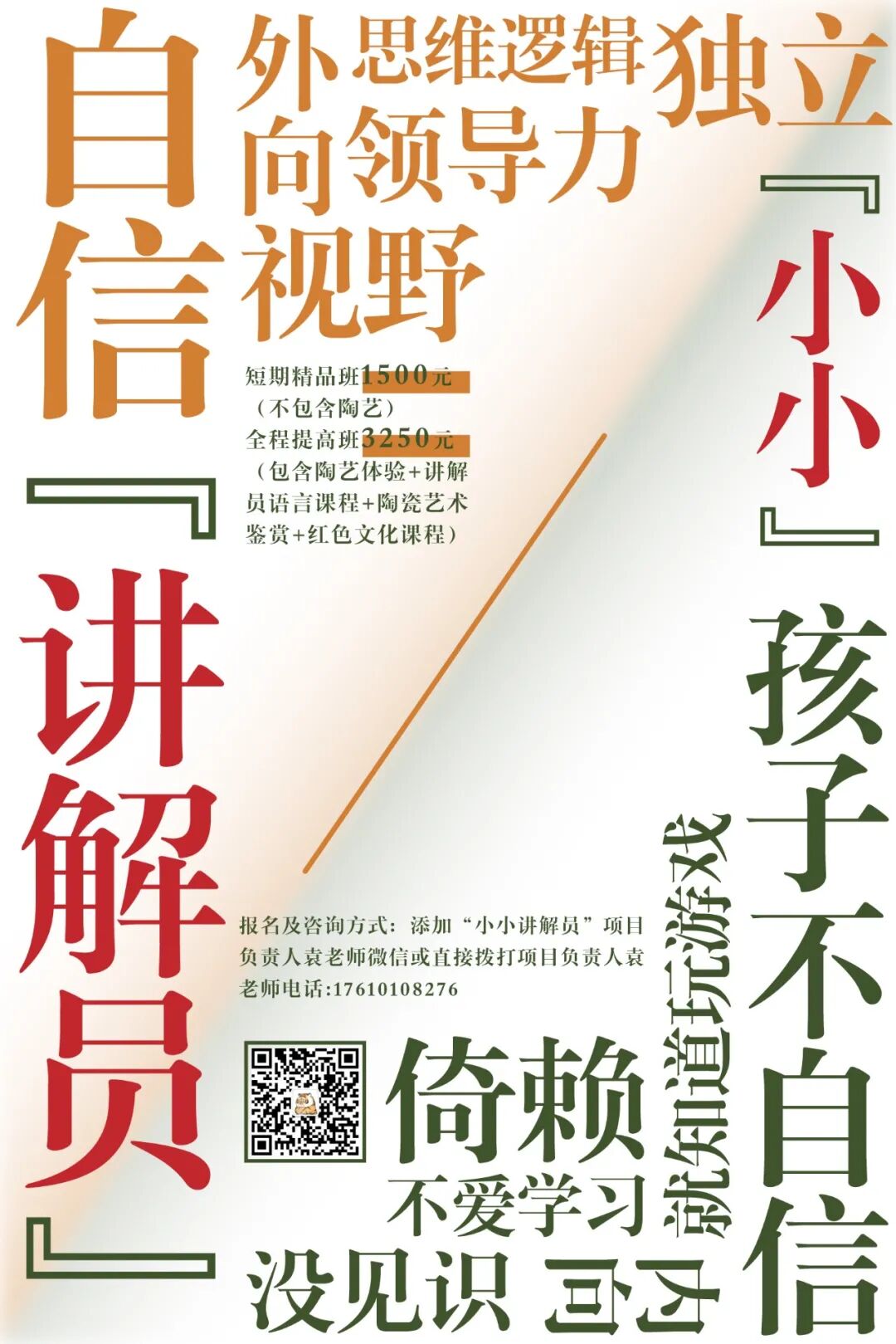 北京陶瓷艺术馆第三期“小小讲解员”培训班于2021年10月正式面向社会全面招生。相比往年课程,今年设立了最为完整的课程学习体系。讲解员语言能力、仪表形体,陶瓷艺术史、陶艺作品鉴赏,红色文化史。既有陶瓷艺术内容,也有红色文化知识;注重能力:以表达能力、讲解能力、沟通能力以及社会适应性为培训重点;综合训练:将动脑、动口、动手训练融为一体。六年下来,北京陶瓷艺术馆接待北京市中小学生20余万人在此学习、参观,培养出一大批倾情于传统陶瓷艺术的年轻骨干教师。在发展过程中,北京陶瓷艺术馆得到了社会方方面面的大力支持;同时获得了多方专业机构的支持,包括中央美术学院、清华大学、景德镇陶瓷学院、国内各大产瓷区等,另外也有幸与国内最知名的美术大师、学者合作。六年磨一剑,对于第三期“小小讲解员”培训班,北京陶瓷艺术馆集中发力,力争为前来报名的孩子在成长的过程中增添一份色彩。北京陶瓷艺术馆目前有多位知名陶瓷艺术家,与行业内艺术评论人、策展人和业内专业人士保持紧密合作。其中,馆内常驻名师有:全国陶瓷行业技术能手、河北省陶瓷艺术大师任峰、黑陶非遗传承人、通化师范学院美术学院客座教授钟离子、全国陶瓷技术行业技术能手 、河北省陶瓷手拉坯技艺冠军刘全民、从事陶瓷艺术雕塑行业三十余年的陶艺名师来东山等。除此之外,在语言技能方面,北京陶瓷艺术馆讲解员师资团队更是实力超强,团队有六年实战经验,接待观众近百万人,讲解员老师能够面对不同的观众出色的完成讲解任务,形成自己个人ip而闻名业内。在普通话考核、语言表达、性格特征、心理素质、反应能力、组织能力等方面,北京陶瓷艺术馆讲解员师资团队早已形成自己的独特课程“秘籍”与方法,在培训班会全部教给孩子。其中,全程班为2022年1月寒假起,连续二十期,共十天课程。短期班为2021年11月7日起,每周两期,共十期,上课时间为周日(可根据学员情况灵活调整),共五周。时间可提前预约报名安排。拒绝“填鸭式”教授,旨在开掘孩子个性,寓教于乐,让孩子建立自信,喜欢艺术,喜欢表达。精品班学完之后,通过综合考核的学员,颁授《北京陶瓷艺术馆小小讲解员结业证书》。全程班毕业之后,通过综合考核的学员,颁授《北京陶瓷艺术馆小小讲解员结业证书》和《北京陶瓷艺术馆讲解员证书》,后续会以小嘉宾身份受邀参加北京陶瓷艺术馆的大型活动展事。课程全程录像,便于回顾、观摩,而且在课程结束后,根据有要求的家长会为其制作自己家孩子成长蜕变为讲解员闪闪发光的一刻视频,方便作为孩子成长道路上印迹的留存。赫克曼曲线表明,8岁以上的孩子,是培训思维能力的最佳时期,越早开始越受益。我们针对所有学员家长,建立爸妈圈,便于大家长期交流,共同促进孩子的良性发展。【全程提高班】2022年1月起(寒假)课程开始,每日两期,共二十期,集中授课。全程提高班3250元(包含陶艺体验+讲解员语言课程+陶瓷艺术鉴赏+红色文化课程)线上前十名报名者享至少200元以上优惠的早鸟折扣价,详情咨询袁老师。