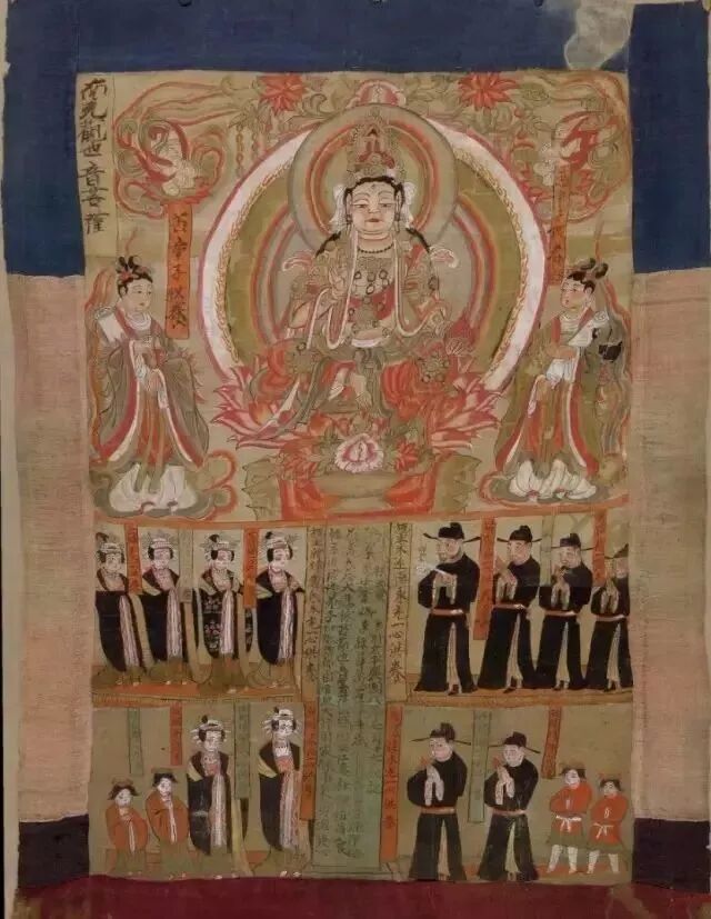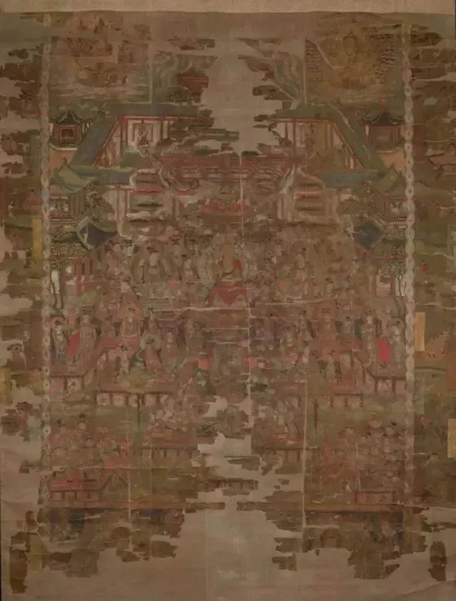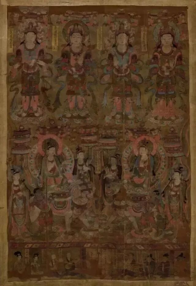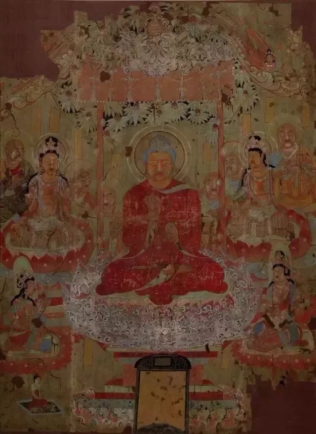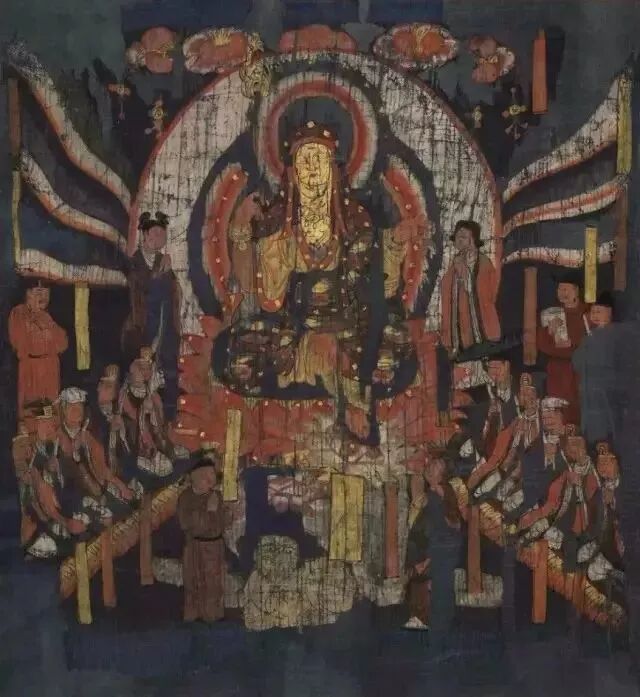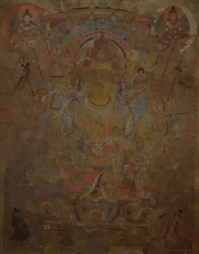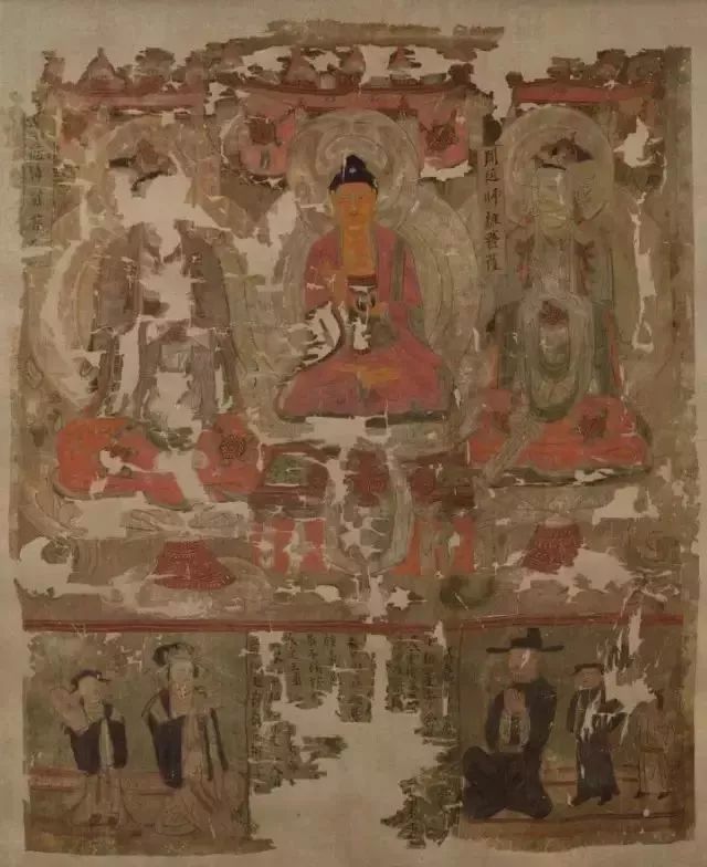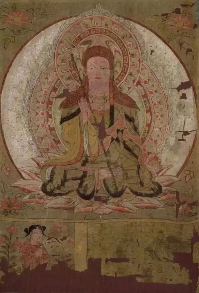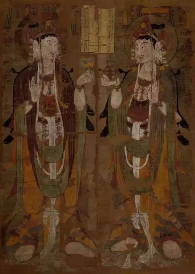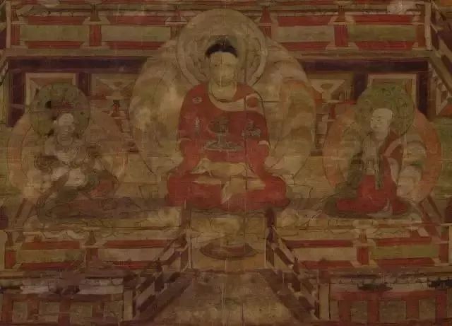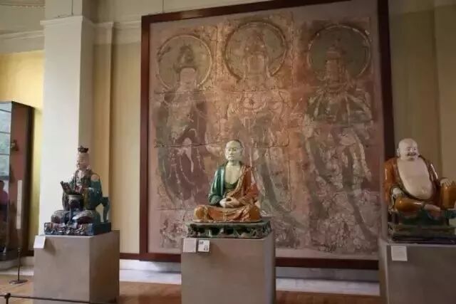 三彩罗汉背后的敦煌壁画,其割痕虽犹可见,却难掩其久远的鲜丽及三位“浓丽丰肥”菩萨的雍容华贵。