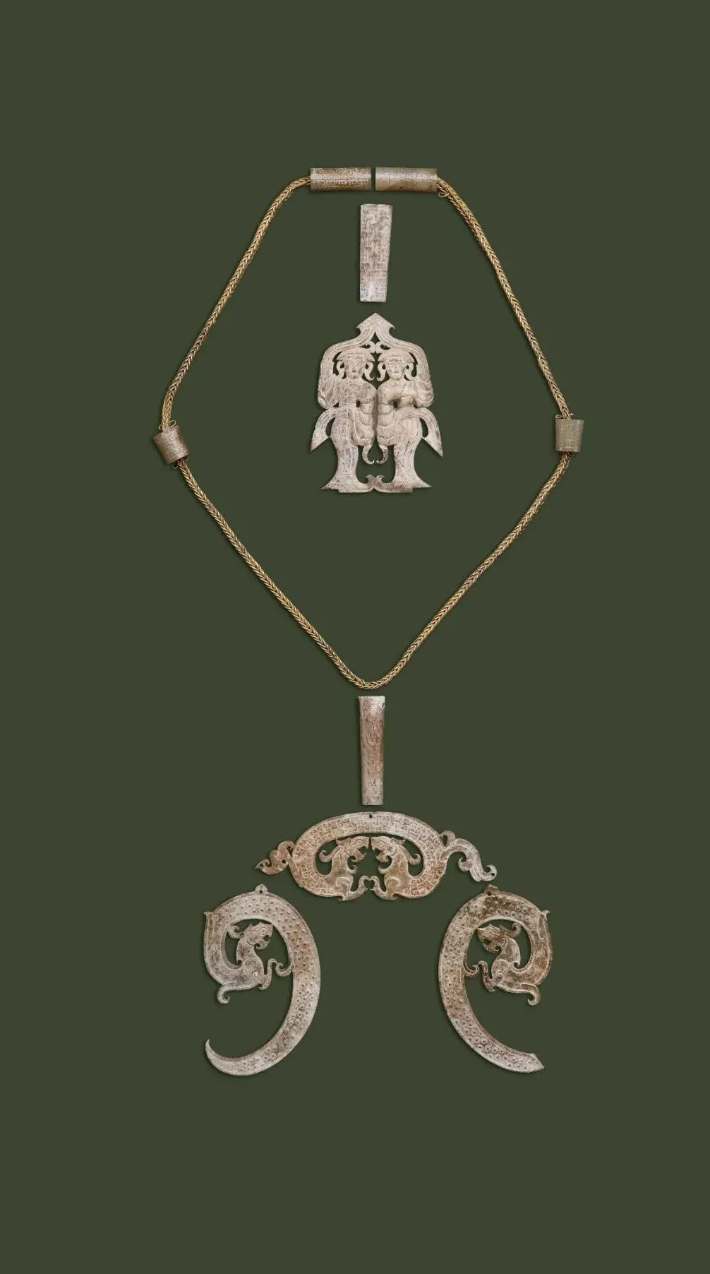 佛利尔美术馆藏金链玉佩饰亦被视为金村玉器的巅峰。该组佩饰包括连体玉舞人饰一、玉管二、弓形玉璜一和玉觽二,由金链串成。怀履光特地说明,这组佩饰是复原的结果,换言之,是20世纪之后重构的认知,构件和组合关系均无法确定。梅原末治补充了同属于佛利尔美术馆的单体玉舞人。