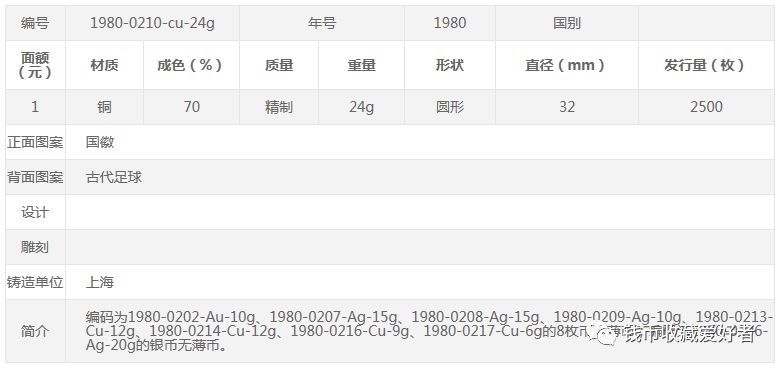 1980年还发行了中国奥林匹克委员会铜质纪念币4枚,其中24克重2枚、18克重1枚、12克重1枚,发行量均为2500枚,面值1元,同样有普通版和加厚版。这套铜质纪念币的特点是,相同面值(都是1元)但是直径却不相同,直径有32、28、23毫米3种规格。其设计空间感强、相映成趣,题材鲜明,图案高古典雅、优美非凡,是近年来发行的纪念币无法比拟的。