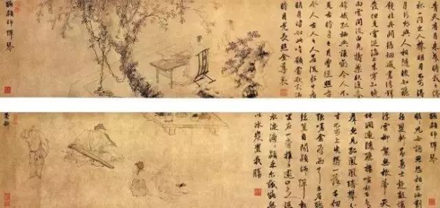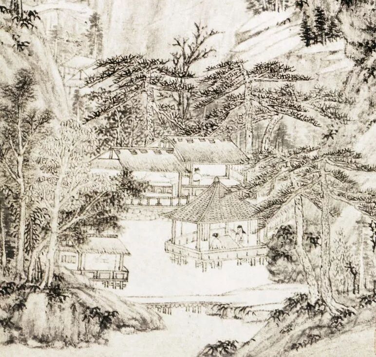 《南屏雅集图》是描写元末名士杨维桢春日携友携妓游西湖,在南屏山下莫景行山庄中宴饮酬唱时的情景,作于天顺四年,是戴进晚年的代表作。