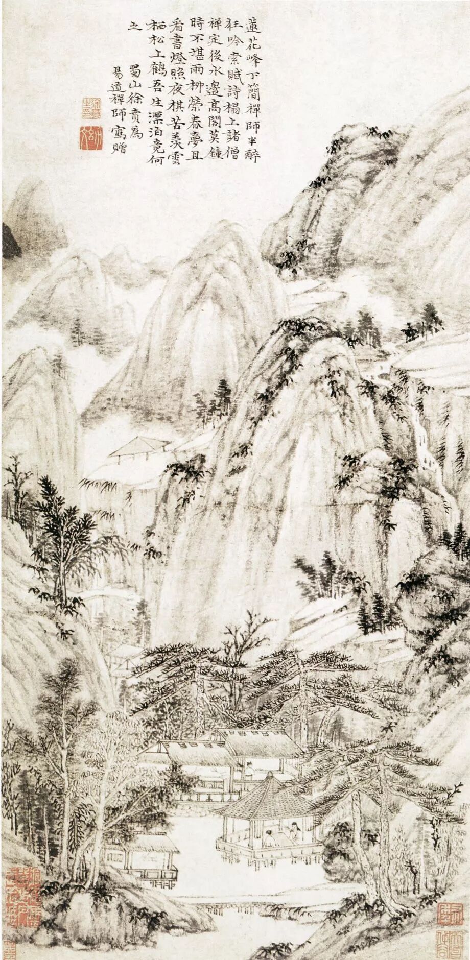 他凭借想象描绘庐山为他的老师陈宽作寿。整幅作品在近于王蒙的繁密的笔墨中展现了想象中庐山的雄伟,开创了以山水画象征人品的表现手法。