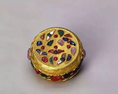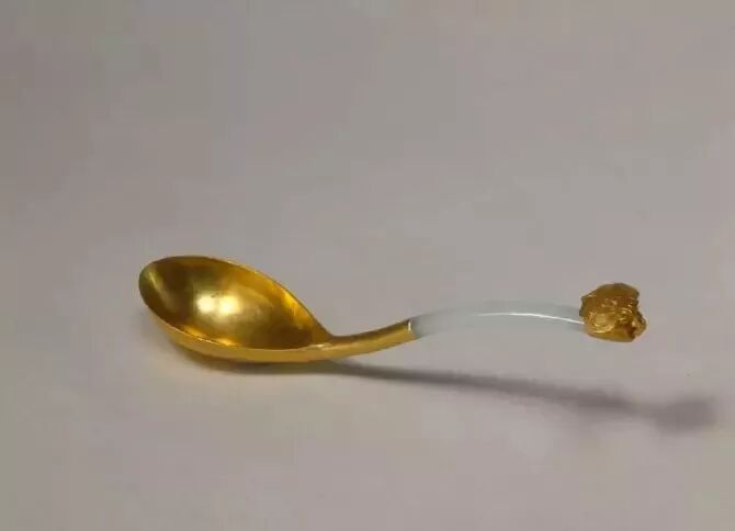 长42.7cm,柄宽5.4cm,头最宽11.3cm.如意为木胎,其上采用八成金质累丝工艺。如意头的正面为累丝古钱纹,中心嵌绿松石“乙酉”二字,背面为镂空的古钱纹并露出木胎。柄的正面亦为累丝古钱纹,镶嵌绿松石“万年如意”四字,背面为累丝六角锦纹。如意的侧边以卷草纹为饰。此如意为一套60柄之一,是乾隆皇帝六十寿辰时王公大臣们的进献之物。各如意头正面分别镶嵌“甲子”、“乙丑”、“癸亥”等干支记年字样,正合六十甲子一周。如意的做工精湛、细腻、繁复,是清代乾隆时期的典型作品。这件金如意小巧可爱,玲珑剔透,柄上透雕以双柿、卍字纹,寓意“万事如意”。这样小巧的如意,很可能是一组陈设品中的一件。匙两端金制,柄中段套接青玉圆柄。如意云头形金柄端表面双钩开光内錾刻“囍”字。金、玉的使用历来是地位和财富的象征。在中国历史上,美玉的使用较黄金要早许多,两者在很长一段时间内并行发展。皇家用具,极尽奢华之能事,金、玉不仅用于服饰或陈设,也用于饮食器具,展示了金玉满堂的富贵荣华。清代帝王大婚或是万寿庆典,通常专门制作成套精美的服装、饰品、器用,并分别装饰标志性的“喜”、“囍”或“寿”字。盒为圆形,九成金质,盖面嵌宝石碧玺等云蝠花纹,盖边嵌碧玺菊花,盖边及底边錾花“卍”字纹,盒底有“宝华”、“足金”戳记。此盒錾刻工艺极其精緻,为后妃盛放胭脂等物品所用。此杯银镀金,杯口沿下雨腹近圈足处各饰一圈雷纹,腹部在米粒锦地纹上錾缠枝纹,中有二凤穿枝飞舞。