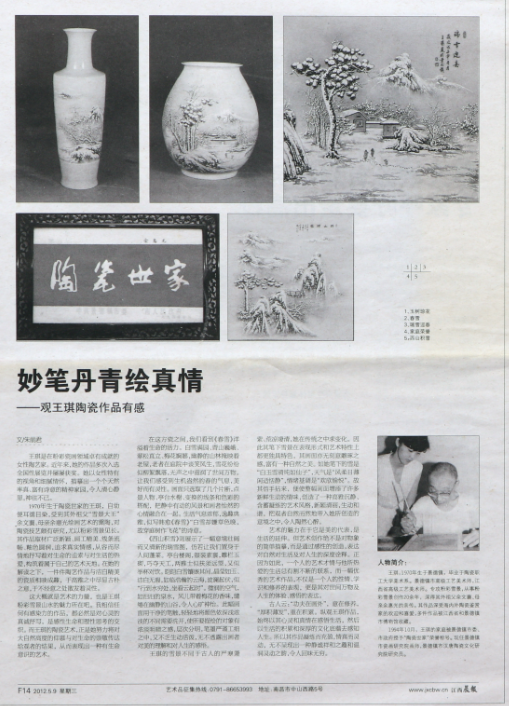 1994年,年仅24岁的王琪作为景德镇雪景瓷世家传人与王锡良、张松茂等同选为24户陶瓷世家,王琪外祖父为“雪景大王”余文襄,余文襄作为景德镇雪景瓷世家的开创者,将雪景瓷的发展向前推进了一步。