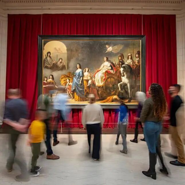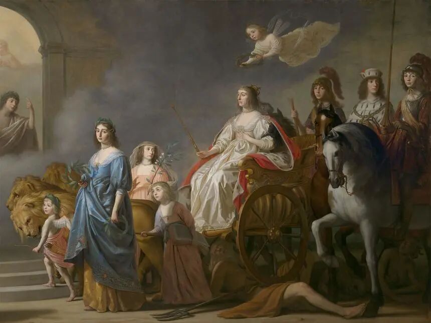 杰拉德·范·洪索斯特的巨型画作《冬日女王的胜利:正义的寓言》(1636年)尺寸为10x15英尺。这幅画集中展现了“流亡时的创造力”。这幅不朽的画作部分是寓言,部分是全家福,是前波西米亚女王伊丽莎白·斯图亚特(因其短暂的统治而被昵称为 "冬日女王")在1620年被流放到荷兰很久之后委托艺术家创作的。