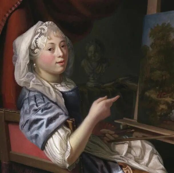 左下:《艺术家在工作室的自画像》,玛丽亚·沙尔肯,约1680年,木板油画