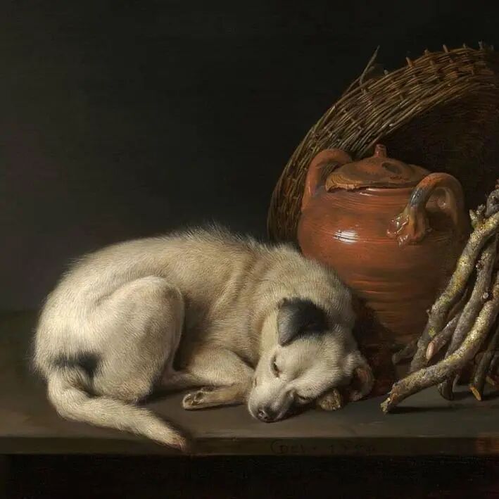 右下:《休息中的狗》,格里特·道,荷兰,1650年,木板油画