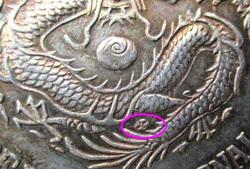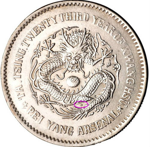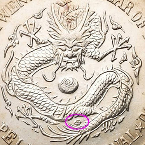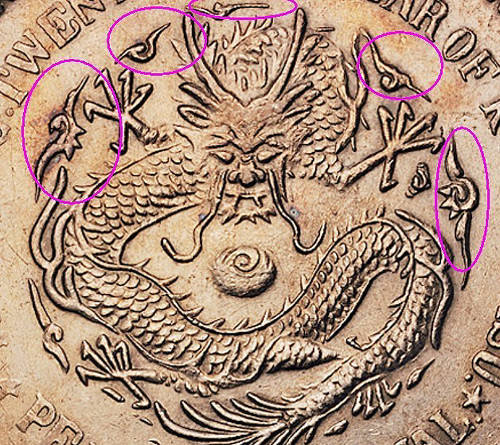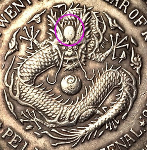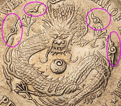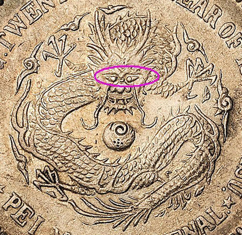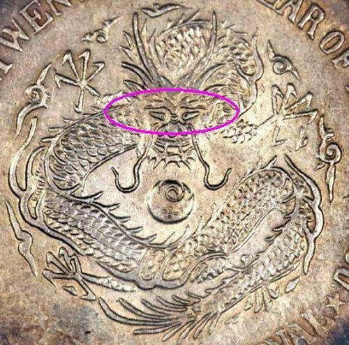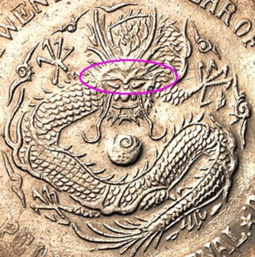 狗头龙:这是北洋23公认的珍稀品,存世量很是稀少,是收藏北洋23系列最难得到的一个品种。其字面完全是普通圆眼龙的风格,龙面有明显修模,龙头和云朵最为明显。如图:龙头中间多了一个大圆头,云朵体系完全独树一帜