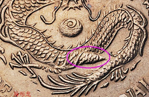 因此,三角眼与异形龙是两个完全不同的龙体系,彼此之间是彻底的重新修模,修改幅度极大,绝不可以混为一谈,从存世量来讲,异形龙更少一些。至于圆眼龙与前两种龙的差别就一目了然了。从修模历程来看,圆眼龙存世量最大并且风格特征与北洋24的风格基本一致,故而圆眼龙应为北洋23的后期龙系。异形龙的版别主要用龙尾部分来划分,分为三个版别:异形龙尾上花,异形龙尾上十字,普通异形龙。