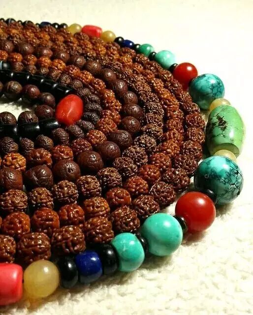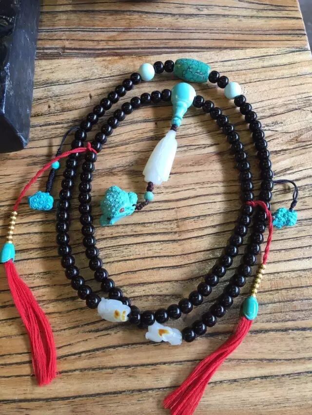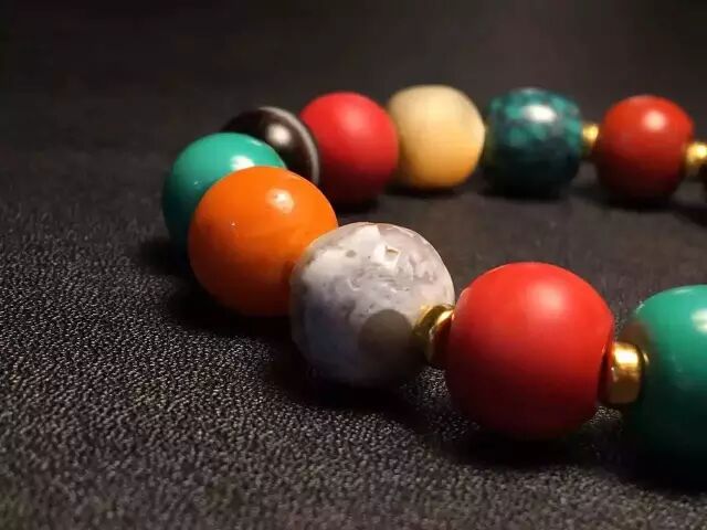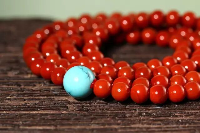 绿松石多用于藏式佛珠中,因为藏族人多偏爱绿松石。通常椰壳搭配几颗绿松石,通过深色的衬托,将绿松石显得更漂亮。