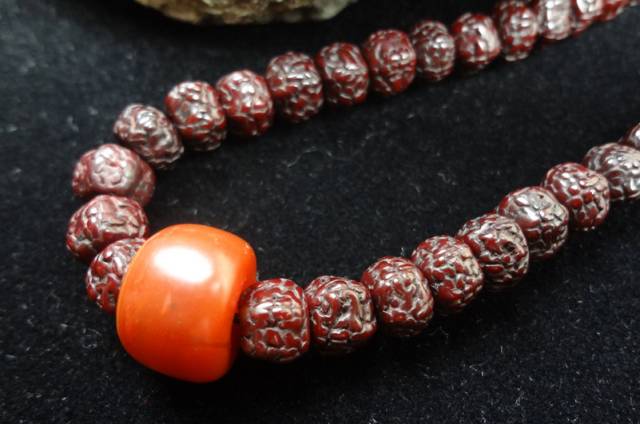 这种搭配通常是选择一个色系的不同材质来搭配自己的手串。如喜欢红色,当然非南红莫属。现在南红做配珠非常受欢迎,我们可以用南红来配包浆了的金刚,十分和谐: