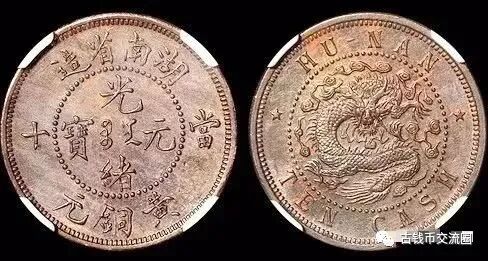 ⊙简介:1905年广西省造光绪元宝飞龙十文铜币样币,“龙尾中有点”版,45°逆背,PCGS SP62BN金盾,为德国代制之样币,未正式发行,目前已知存世仅十余枚,状态极佳,中国铜元之顶级珍品。
