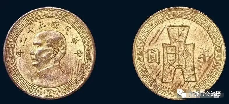 ⊙简介:民国时期双面布图半圆黄铜样币一枚,合面,极为少见,近未使用品。