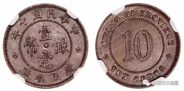⊙简介:民国十年广西省造壹毫银币铜样币,NGC MS63BN。