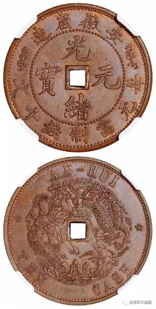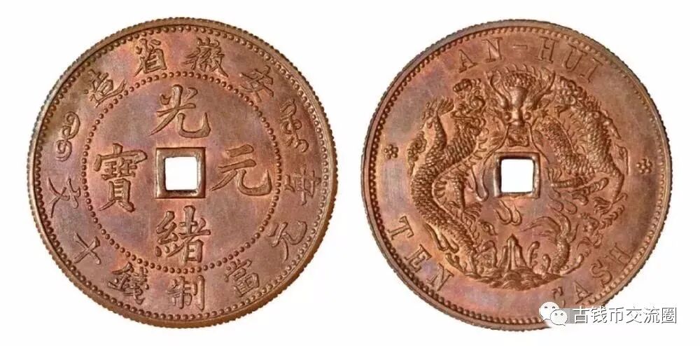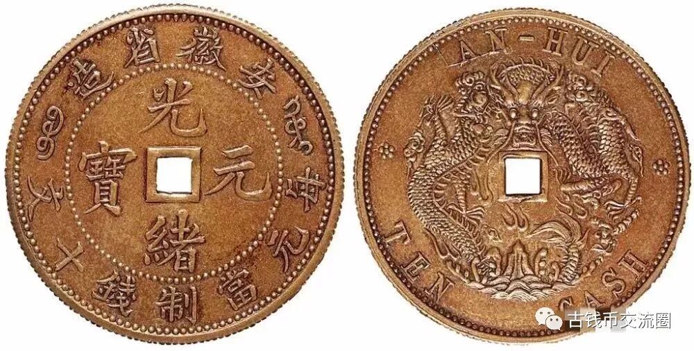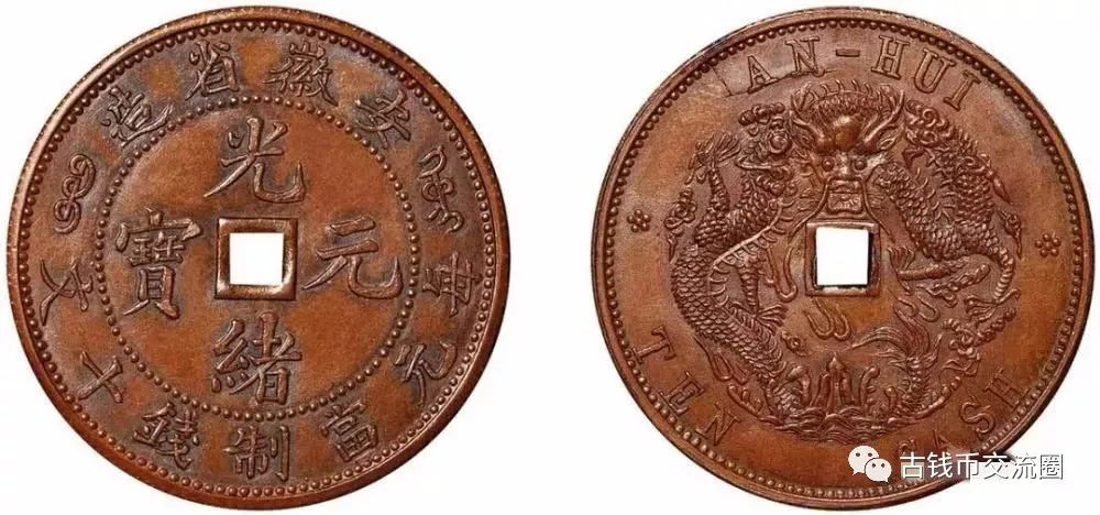 “光绪二十六年,广东省试造铜元,流通顺利,获利甚丰,各省竞相效仿,安徽当局遂由聂缉规奏准设立铜元局。光绪二十八年五月,在安庆设立安徽铜元局,开始试铸五文、十文铜元,安徽方孔十文,可能在当时试铸,因费工费时,且模具极易损坏,所以没有大量制造,存世量不超过二十枚。...安徽方孔十文制作精美,文字、币面设计十分巧妙,中间穿孔兼具传统与现代,为我国铸币史上一朵奇葩,虽然没有名列前茅,但是却是收藏家梦寐以求而不能得之稀罕珍品”-摘自台湾郑仁杰著《中国铜元鉴赏》第15页。
