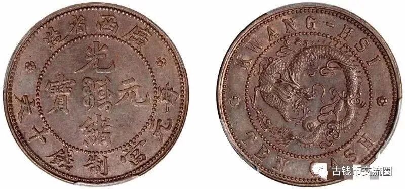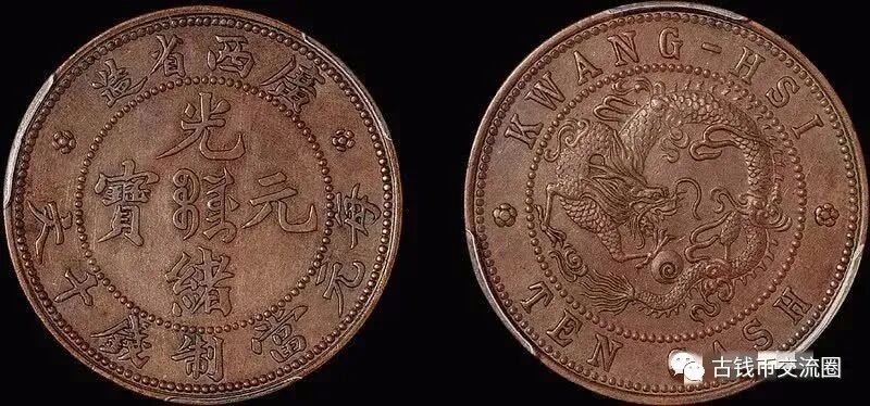 广西光绪十文铜元,红铜质。正面中央铸满文“宝桂”,外环铸“光绪元宝”及珠圈,上缘铸“广西省造”,下缘铸“每元当制钱十文”,左右两侧各铸一“梅花星”;背面中间为龙图,俗称“飞龙”,外环珠圈,上缘铸英文纪地“广西”,下缘铸英文纪值“十文”,左右两侧各铸造一“梅花星”。