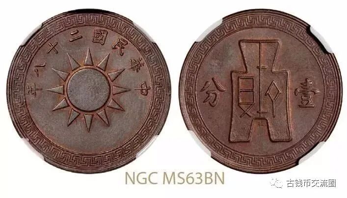 ⊙简介:民国二十八年党徽布图小“桂”字壹分红铜样币,存世甚少,品相极佳,J.C. LEE旧藏,NGC MS63BN。