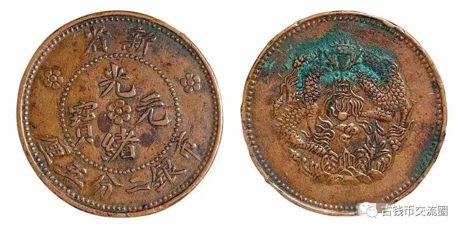 ⊙简介:清代新疆省造新省光绪元宝市银二分五厘铜样币一枚,罕见,极美品。