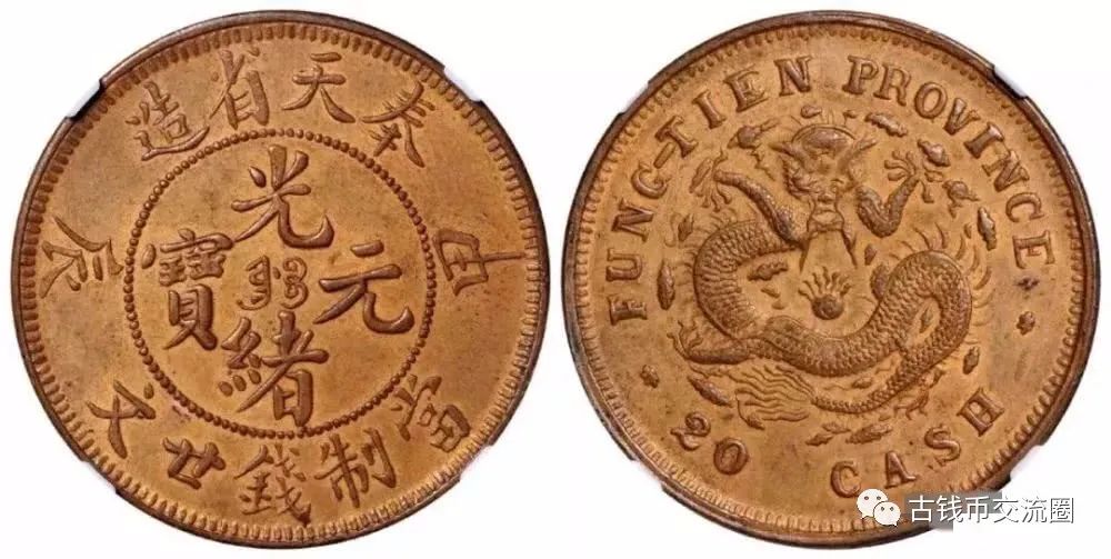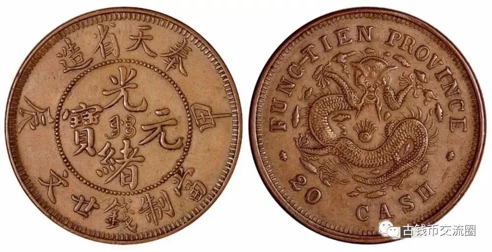 ⊙简介:1904年甲辰奉天省造光绪元宝二十文铜币一枚,红铜质,为试铸样币,目前所知存世仅二枚,中国铜元珍罕品种。