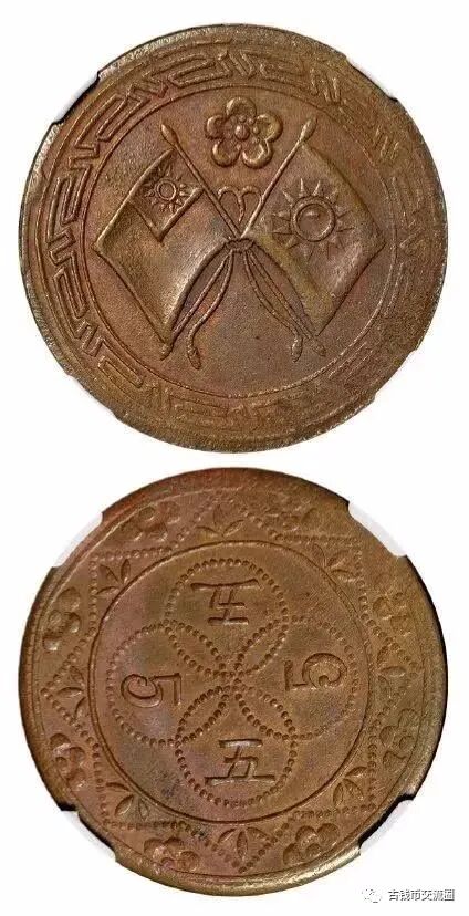 ⊙简介民国时期四川省造双旗梅花图五文铜质试铸样币,J.C.LEE旧藏,存世甚少,NGC AU55.