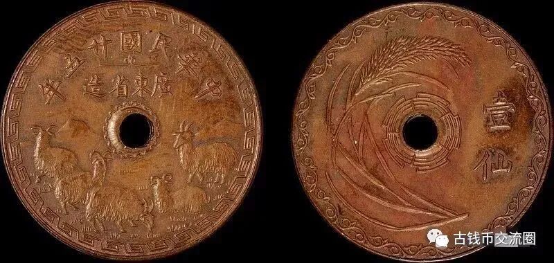 广东省会广州市旧称五羊城,故此枚铜币正面以五只大尾绵羊作为主图案,俗称“五羊仙”。此币铸成之时,恰逢国民政府推行法币政策,大量发行党徽图铜、镍辅币,故未能正式行用。“五羊仙”铜币设计独特,铸造精美,具有籍钱币图案凸显地域特色的先进意识,加之铸造量稀少,一直以来都是收藏者热衷追求的目标,是中国近代铜元中不可多得的珍贵品种。