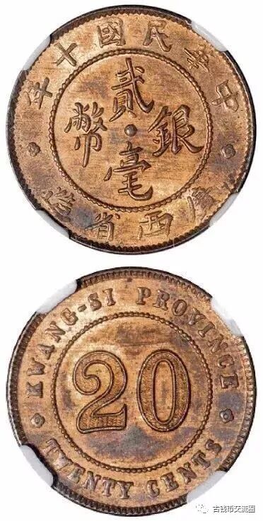 ⊙简介:民国十年广西省造贰毫银币铜样币,铜光极好,品相完美。