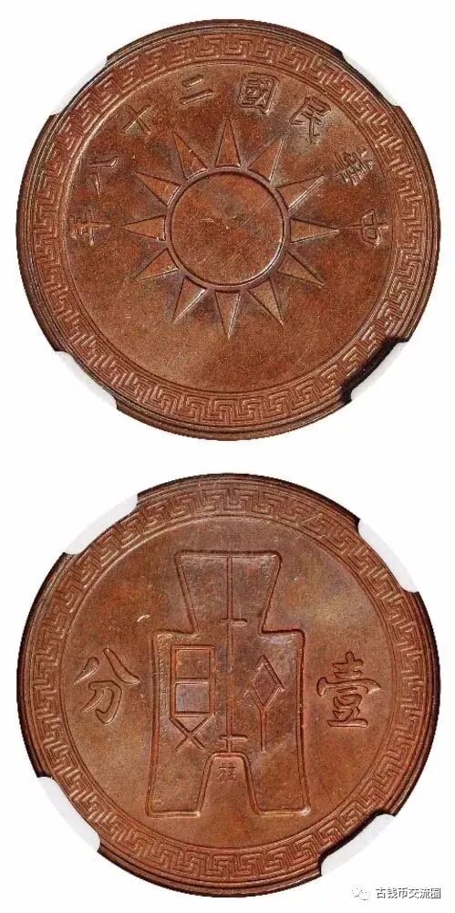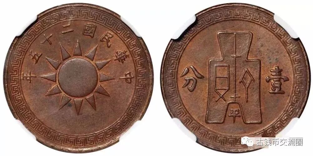 ⊙简介:民国二十五年党徽布图“平”字壹分红铜样币一枚,存世极稀,保存完美,珍罕,NGC MS63BN