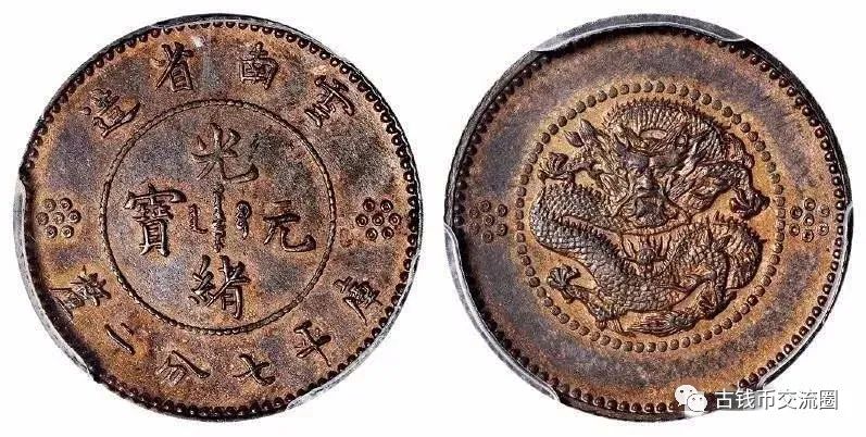 ⊙简介:1911年云南省造光绪元宝库平七分二厘银币铜质样币,齿边,龙面火珠下二小圈,据悉系后期加铸减色之版别区分记号,铜质样币极为少见,PCGS SP62BN,目前获该公司评级入盒者仅此一枚。来源:中国近代著名收藏家族—NC旧藏。
