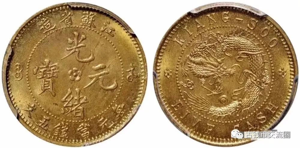 ⊙简介:1902年江苏省造光绪元宝五文飞龙黄铜样币, 原铜光, 品相完美, PCGS SP64, 目前为该公司评级纪录第一名。