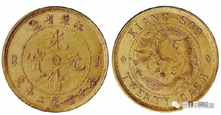 ⊙简介:1902年江苏省造光绪元宝二十文飞龙黄铜样币, 极美品。