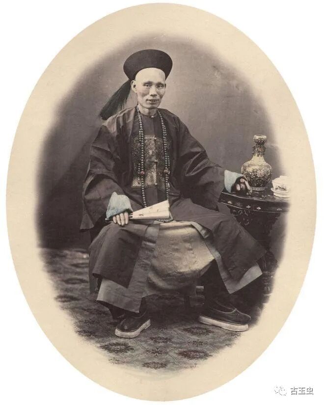 身着清代官服的男子自信地对着镜头,左手拿鼻烟壶、右手持折扇