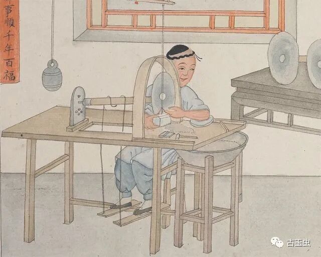 由这十二幅图可以看出,古时的碾玉设备主要就是水磴,以足蹬踏板为动力,带动各种“砣”快速旋转,“砣”上需不停地浇水和沙。