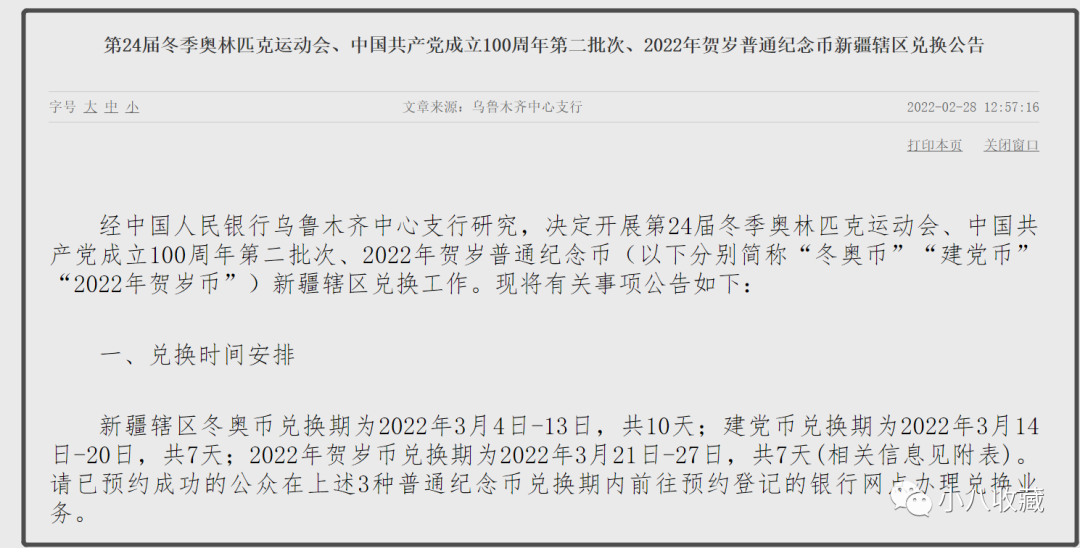 延期兑换的冬奥币和建党币兑换日期也公布了,其中冬奥币的兑换日期为3月4日~3月13日,建党币的兑换日期为3月14日~3月20日。