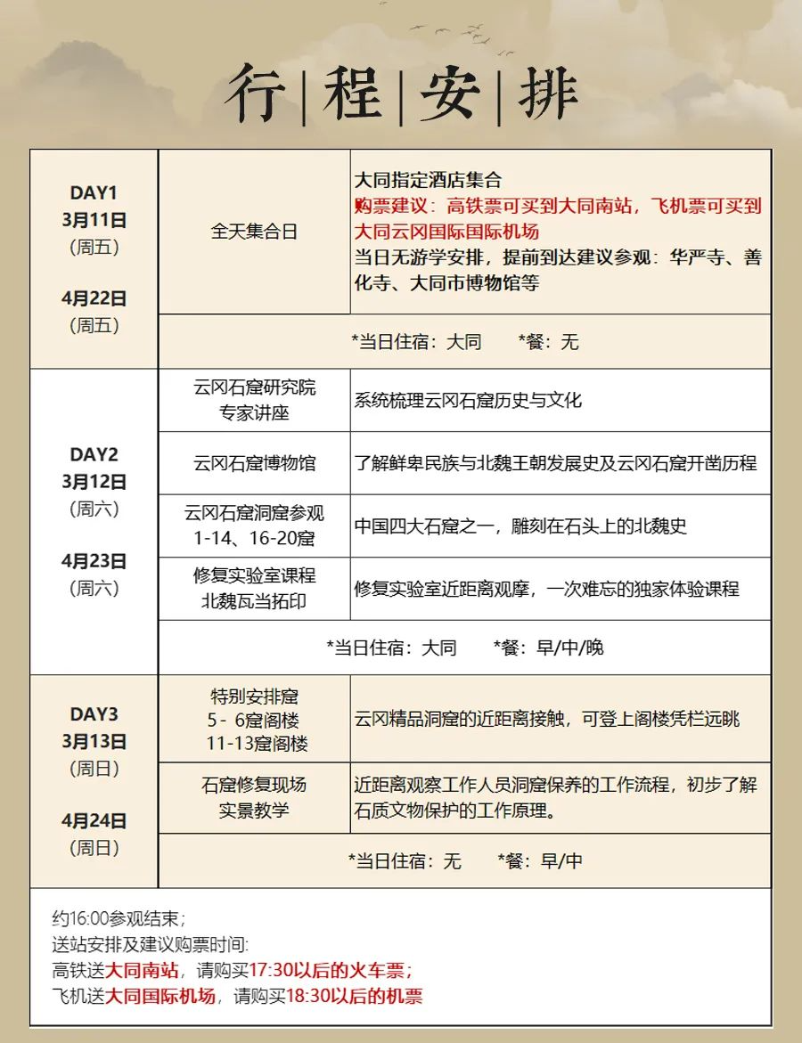 适合人群:石窟爱好者/历史爱好者/国保爱好者/艺术史与佛寺文化爱好者*8人成行,20人封团(如有单房差或向上浮动1人)*报名需二次确认。请不要购买高铁/机票大交通,待客服通知成行后再安排购买。2.住宿:2晚四星酒店住宿(默认标间,如需单房请联系客服补单房差) 3.餐饮:2顿自助早餐+2顿研究院商务餐+1顿丰盛晚餐+全程矿泉水 4.导服:专业讲师随行讲课+文化领队贴心服务+专职司机 5.门票:行程内所有景点首道门票费用,含特窟及云冈石窟景交车 *单房差说明:本活动全程入住标间(1房间2床位),单个报名的,由艺旅根据报名先后顺序或特别要求安排同性拼房。如希望单住的,请补齐单房差以享用整个房间。(一大一小如无法拼房须补房差)1、因疫情或其它原因,由艺旅文化取消的行程无条件退还团费100%;2、行程属于特别定制行程,需提前预约,若因私人原因,取消的行程将扣取部分团费;3、本次旅行最低人数为8人,如未满成团人数,组织方可能取消活动或增加费用(如有任何更改,将第一时间通知);4、本活动仅限低风险地区客人报名,如因疫情原因或其它不可抗力导致行程取消,将全额退款。