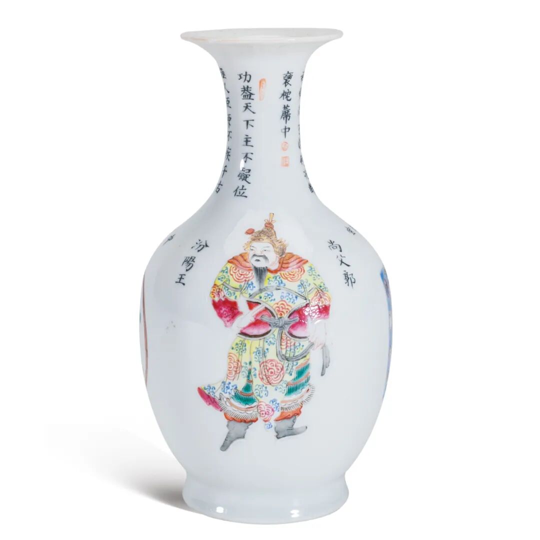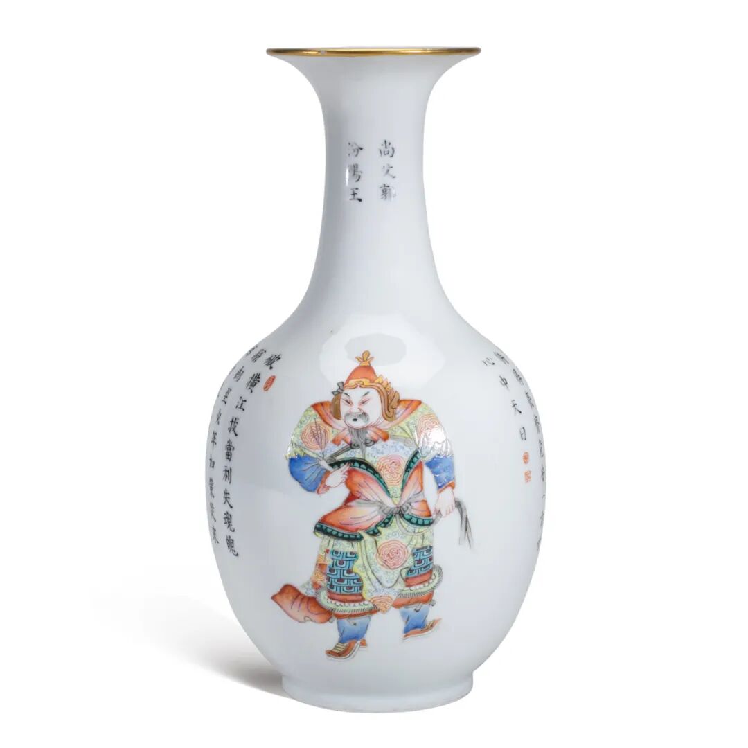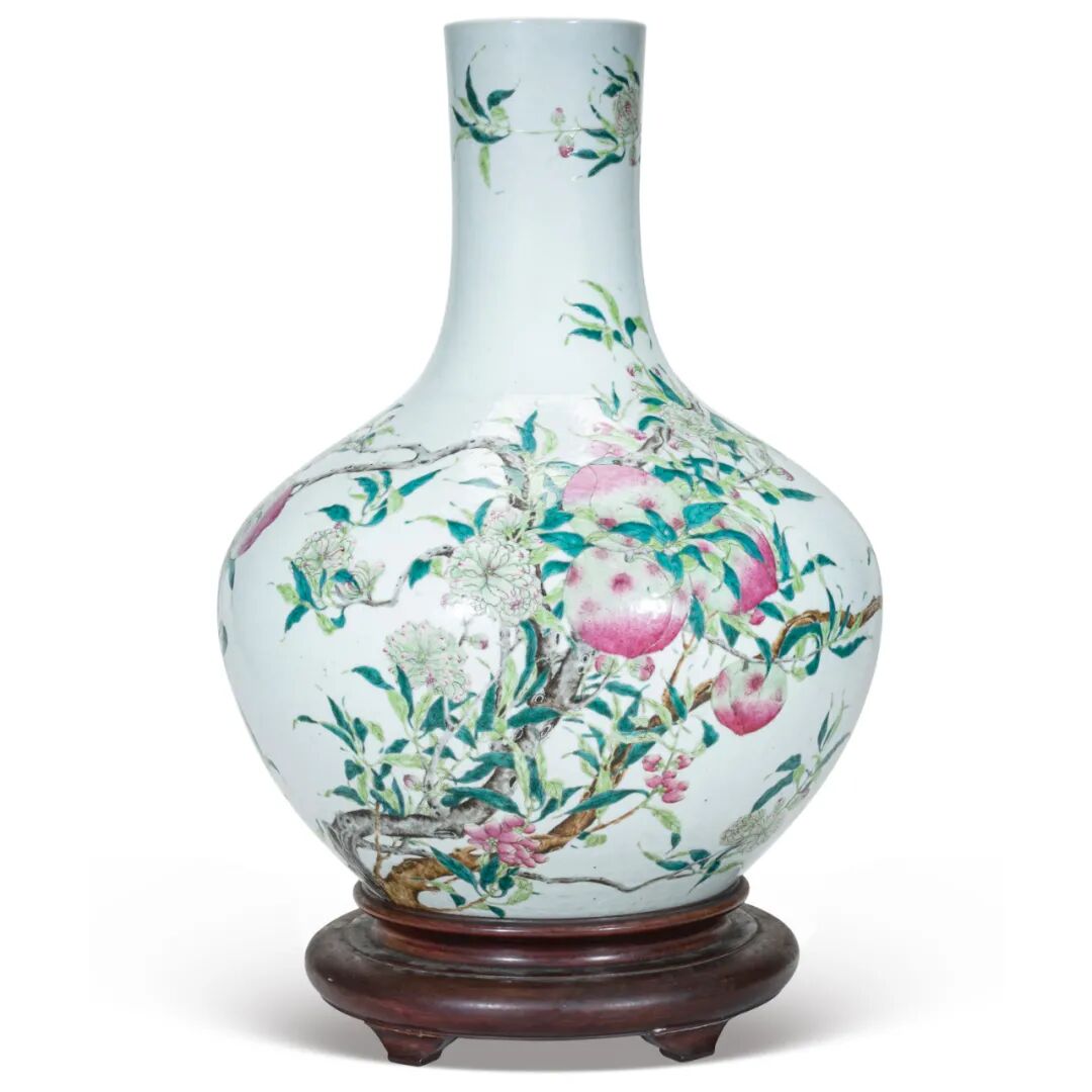 瓶直口长颈,溜肩鼓腹,圈足。通体施白釉,腹部粉彩描绘桃树一株,枝干壮硕,自瓶底而出,沿腹部蜿蜒而上,枝繁叶茂,粉花绿叶,九枚嫣红熟透的桃子悬挂枝头。运用渲染技法,成功地表现出成熟桃实的娇艳色彩,以及枝叶的阴阳向背。构图疏密有致,敷彩娇艳夺目,釉彩浓淡相宜,有“九重春色醉仙桃”之美,寓意多子多孙,多福多寿,吉祥如意。为厅堂陈设佳品。Lot 292 清道光 粉彩无双谱人物瓶