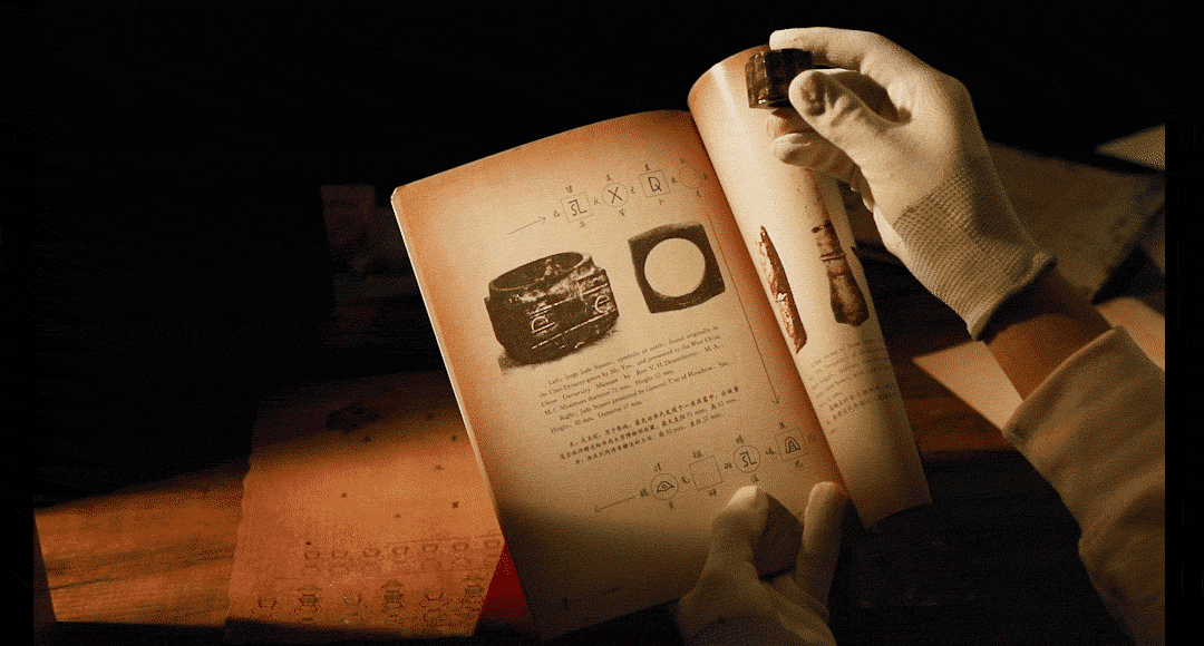 那件古旧的文件袋,复刻的是1920年代西方考古学者的考古报告及其日记。我们选取了最早与三星堆结缘的美国人葛维汉,作为了创作原型,进行人物塑造;
