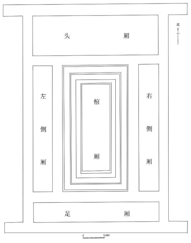 马王堆汉墓平面呈甲字型,墓道北向,其中一号墓墓坑内设有二层台,二号墓靠近棺椁处两侧墓道均有壁龛并放置偶人。马王堆汉墓采用了楚制棺椁,一号墓为一椁四棺,二号墓为两椁两棺,三号墓为一椁三棺;椁与棺之间构成封闭系统,有多处边厢。[16]这种棺椁制度与战国时期楚国墓制极为类似,是典型的间切椁模式:棺厢设置在椁中央,其四周设置四个对称的边厢来埋放随葬品,构成中心对称排列的平面布局。[17]这体现出了典型的楚地墓制风格,这应当与利苍家族均来自于楚地,受南方文化熏陶有关。比对海昏侯墓与马王堆墓的棺椁制度,可以发现两者虽同为列侯级别的墓葬,但形制差异较大,或许与墓主人生活环境与人生经历有很大关系。