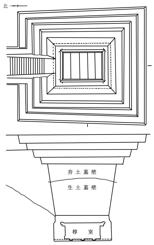 海昏侯墓地的布局,遵循了西汉帝王陵多数为“帝西后东”的制度,海昏侯墓位于墓园西侧,侯夫人墓位于东侧。《周礼·春官·冢人》郑玄注“《汉律》:列侯坟高四丈,关内侯以下至庶人各有差。”海昏侯墓的封土呈覆斗形,高约七米,没有逾越《汉律》规定,也大致符合睡虎地《葬律》中三丈的规定[12](张仲立提出其封土大小有所逾制[13])。