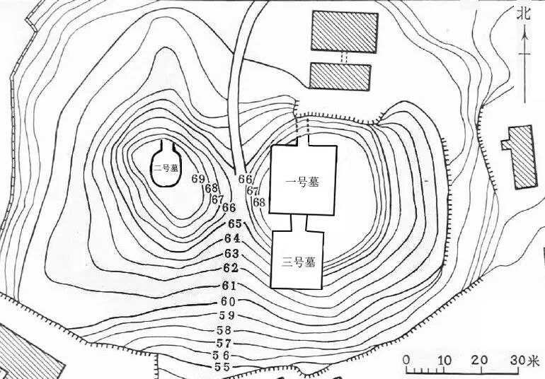马王堆汉墓群位于湖南省长沙市芙蓉区东郊马王堆乡,由一号墓(利苍夫人辛追)、二号墓(轪侯利苍)和三号墓(利苍某子嗣)组成。墓园遗迹现已无存,也未发现有礼制建筑,但从三座墓葬的位置(一号墓与三号墓南北相连。二号墓位于一号墓的正西,两个土塚毗连,呈马鞍状[10])来看,轪侯家族墓地必然是经过提前规划的大型家族墓地,根据墓葬中随葬品的数量与等级来看,轪侯家族是有财力来对其死后的墓园进行系统构建,只是由于时间久远,这些墓园遗迹都随着时间逐渐湮灭,十分遗憾,若是墓园相关遗迹能够保存,同为列侯的轪侯墓园应当不会比海昏侯墓园布局相差太多。[11]