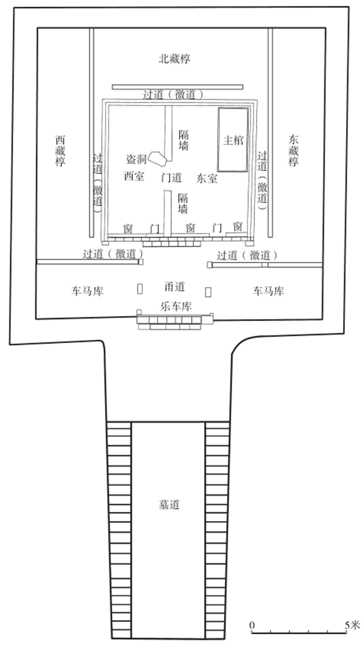 海昏侯墓平面呈甲字型,墓道南向,斜向连入墓室。采用汉制棺椁,椁室由主椁室、过道、回廊形藏椁和甬道构成。椁室中央为主椁室;周围环绕以回廊形藏椁;主椁室与藏椁之间辟有过道;主椁室和墓道之间由甬道相连接。棺柩位于主椁室的东室东北部,使用内、外两重棺,与主椁室、过道、回廊形藏椁共同构成五重棺椁形式。[14]这种棺椁形制比较接近于西汉早中期回廊形室墓的特点,与长沙市象鼻嘴M1、西安市新安砖厂墓等极为类似[15]。海昏侯墓内椁、室并存,除周围的外藏椁外,盛放刘贺内棺的主椁室木板分为东、西两室,中开东西向门道,椁室南侧开有门窗与甬道相连,这在西汉早中期墓葬的发现中极为少见。由于目前没有更详细的资料披露,尚不清楚主椁室器物出土的位置,但刘贺内棺位于东室一侧,且秦汉时期以东为尊,故而东室应为刘贺的寝室,西室则为“前朝后寝”中处理事情的朝室。
