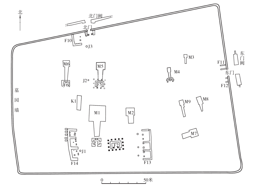 除以上几点外,在M1和M2前还发现有保存较为完整的礼制性高台建筑,由东西厢房(F13、F14)、寝(F1)和祠堂(F2)构成,总面积约4000平方米,M4、M5、M6前也发现有类似祠堂的建筑基址,拥有较为完备的祭祀体系。