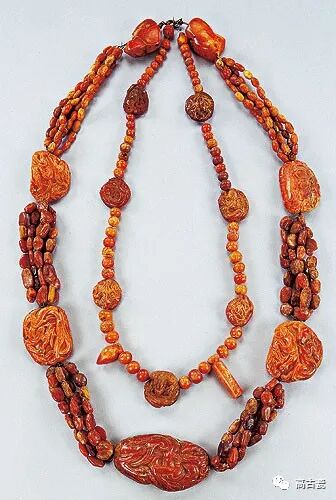 璎珞为深具契丹民族特色的项饰,是其信奉佛教并将佛教思想世俗化的代表饰物。在中国历史上,没有任何一个朝代或民族,像契丹人那样崇尚琥珀。琥珀的流行也许与契丹人尚佛相关,因为佛教认为水晶代表佛骨,而琥珀代表佛血。该璎珞是迄今所见最大的琥珀饰件,其外串264件,由5小串257颗琥珀珠和5件琥珀浮雕饰件、2件素面琥珀饰件以细银丝相间穿缀而成;内串69件,由60颗琥珀珠和9件圆雕、浮雕琥珀饰件以细银丝相间穿缀组成。琥珀浮雕饰件纹样主要为龙纹,图案抽象而富于动感。特长的璎珞不适宜日常游牧生活佩戴,多应用于神圣、重要场合。