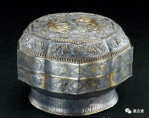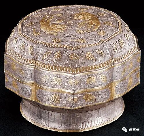 妆奁盒。也可作为食盒使用。模压成形。凸起纹饰鎏金,十曲花瓣形口。顶部模压一对相互追逐的狮子,衬饰缠枝花纹,其外饰花瓣纹、云纹、双鸟蝶花纹等。通体鱼子纹作地。盖顶边缘饰折枝牡丹花纹。盒盖和盒身侧面饰缠枝花纹,圈足饰荷叶纹。狮子于西汉时自西域传入,被视为祥瑞之兽。佛教对于狮子极为推崇,《玉芝堂谈荟》称“释者以狮子勇猛精进,为文殊菩萨骑者” 。以狮为主的组合纹饰作为一种具有宗教意味的装饰纹样随着佛教在辽的传播而为契丹人所崇尚。象征吉祥富贵、繁荣昌盛的牡丹花纹也被契丹人接受和喜爱,并广泛应用于装饰领域,反映了契丹人对精神世界的追求及其与汉族的文化交流。