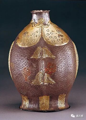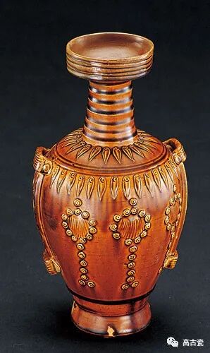 穿带瓶是契丹民族游牧时于马背上携带的盛器,此类瓶最大的特点是两侧肩部与腹部有对称的桥形穿带和竖直的凹槽,均为牢固系带而设计,方便背负,反映了辽瓷非常注重附加实用装饰。
